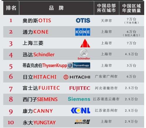 根据《中国电梯行业白皮书》数据显示,以下是我国国产电梯品牌的市场排名: